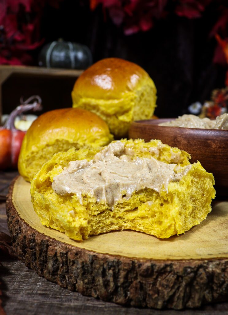 Take a tour through the Shire where hobbits are enjoying their favourite comfort foods from the cozy warmth of a hobbit hole. Soft pumpkin rolls with a slathering of sweet whipped spice butter is the perfect fall delicacy to enjoy in the Shire. Perfect for a tea time snack or served alongside a harvest meal.