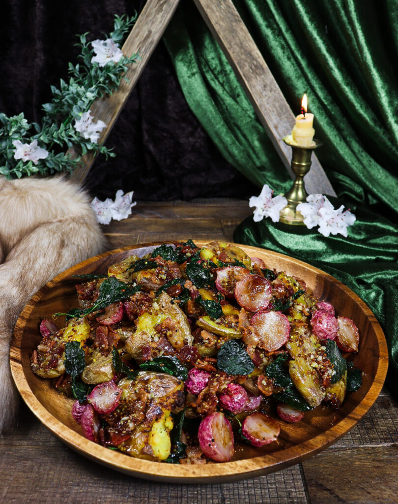 Crispy Smashed Potatoes and Radishes with Bacon Vinaigrette