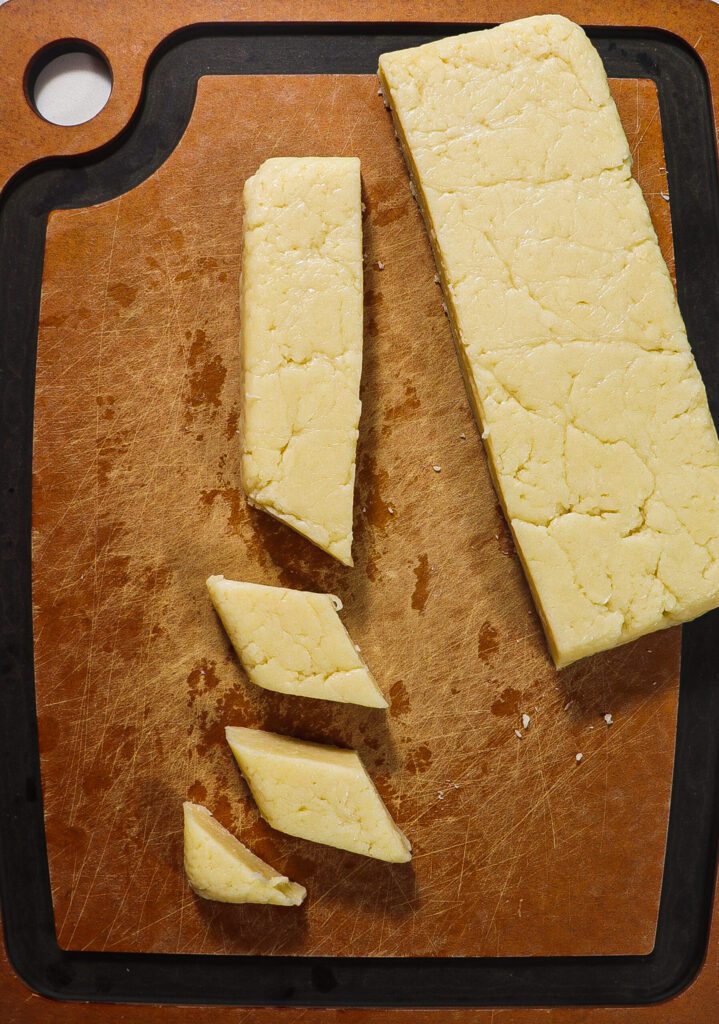 Fill a deep skillet or saucepan with about 2 inches of vegetable oil. Remove the chilled and hardened dough from the loaf pan. Using a sharp knife, cut the dough into small pieces. These can be cubes or diamond shapes – whatever you prefer. You may find it easier to cut the dough by rinsing the knife in between cuts.