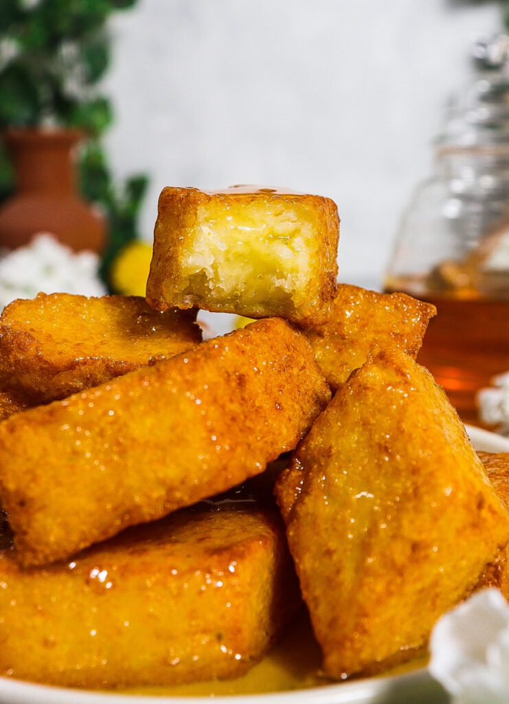 • To serve the fritters, gently warm the honey so it pours easily. Transfer the fritters to a serving plate and drizzle generously with the honey. Turn them over so that the honey coats each side of the fritters. Serve and enjoy!