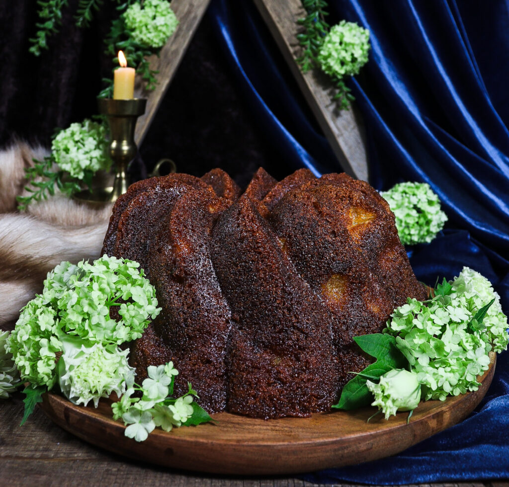 A tender and moist apple mead honey cake served with a dollop of whipped cream inspired by the Norse goddess Idunn and her golden apples!