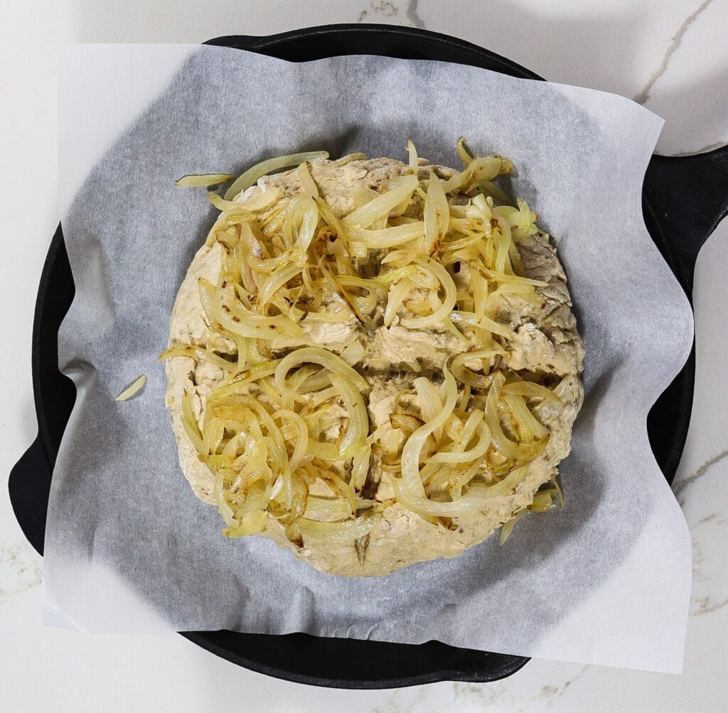 Bake for 15 minutes and then loosely tent the bread with a piece of foil. This will prevent the onions from burning before the bread is fully baked. Continue to bake for another 35 to 45 minutes until the bread is fully cooked and sounds hollow when tapped on the bottom. If desired, the foil can be removed during the last few minutes to brown the onions and bread. Transfer to a rack and cool.