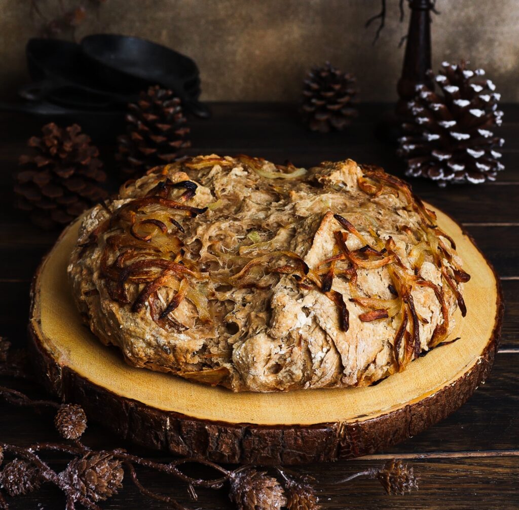 Add the stout to the dry ingredients and mix together with a wooden spoon. Switch to using your hands when the mixture becomes stiff and lightly knead until the dough comes together. Shape the dough into a ball and transfer to the prepared cast iron skillet. Use a sharp knife to score a cross on top. Scatter the remaining onions over the dough.