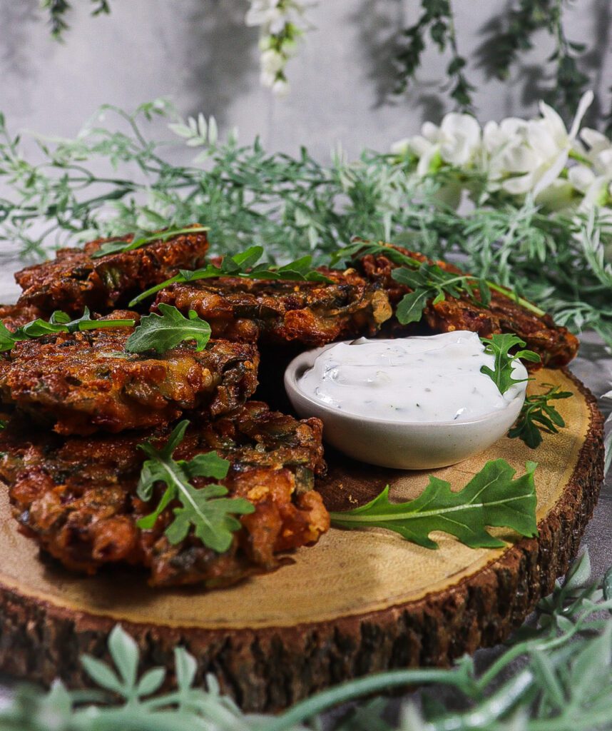 • Arrange the chard fritters on a serving platter. Serve the fritters with the yogurt sauce and enjoy!