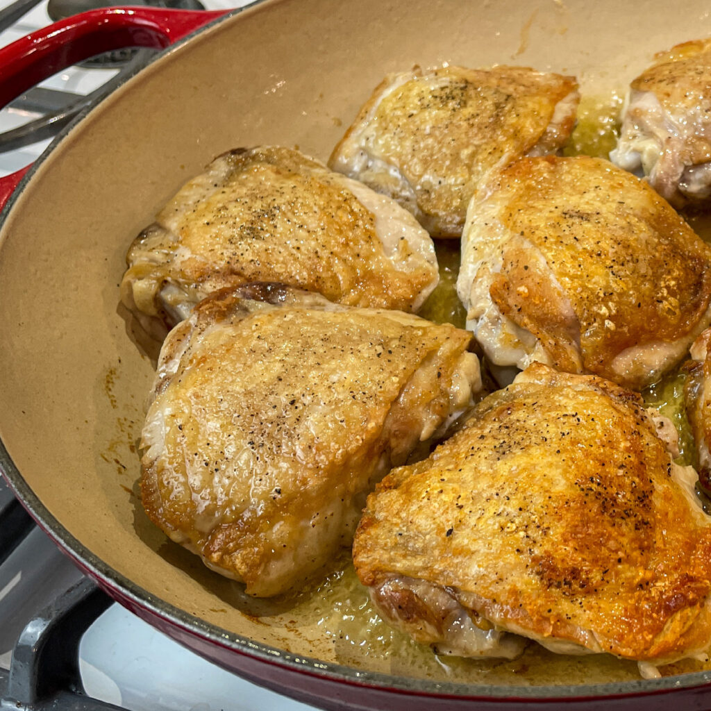 Season the chicken thighs with kosher salt and pepper. Heat a wide, deep skillet or brazier over medium high heat. When the pan is hot, add the olive oil and the chicken thighs skin side down. Sear the chicken thighs until the skin is well browned – don’t rush this step, really let the skin crisp up and brown. When browned, flip the thighs over and briefly sear the bottom.