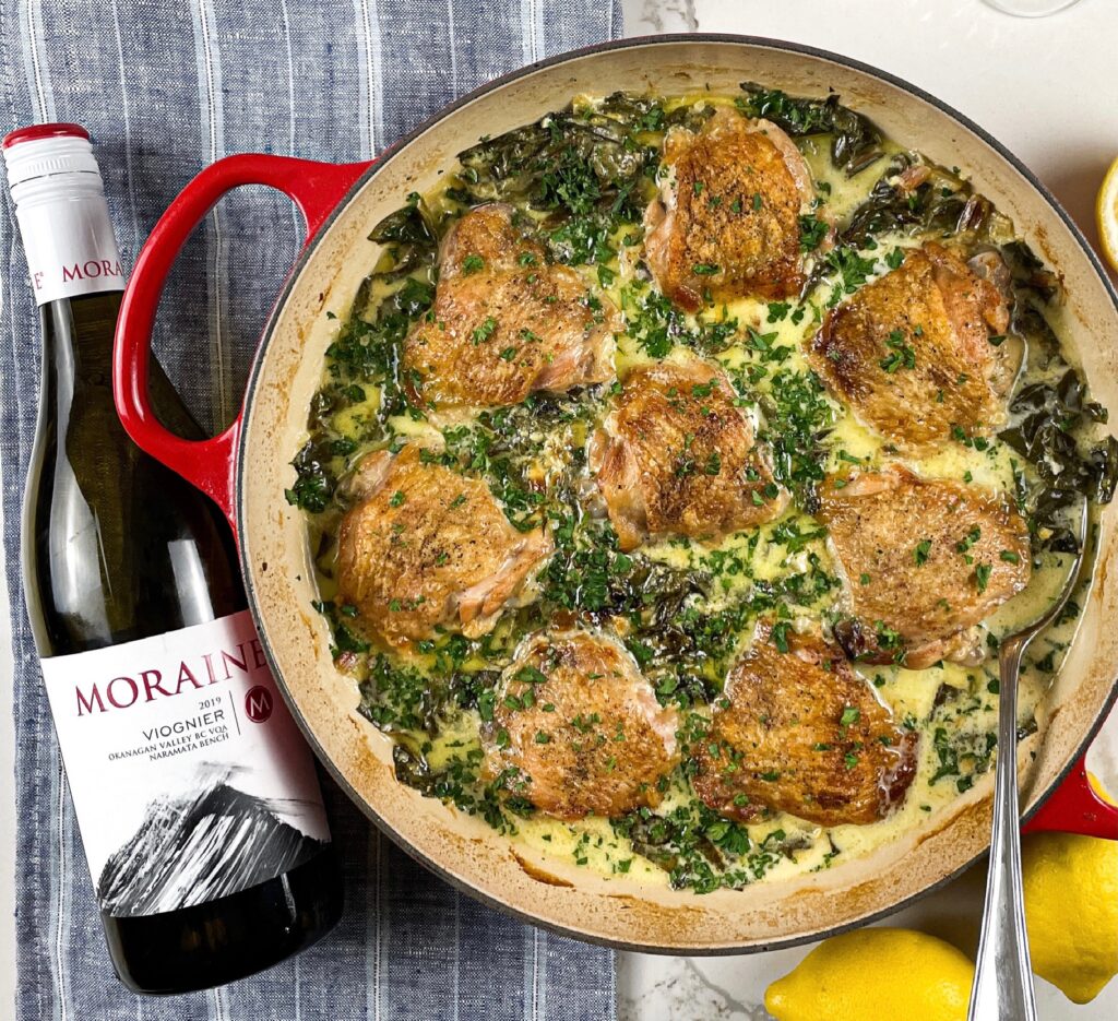 For wine suggestions, the dominant flavours of chicken with lemon and cream traditionally go exceptionally well with Chardonnay. I recently enjoyed it with a bottle of 2018 Tribute Series Chardonnay from Meyer Family Vineyards in Okanagan Falls, BC. Another suggestion would be to try a Viognier, which I feel is a great food white wine and would hold up well with a rich dish like this. A favourite of ours is the Viognier from Moraine Estate Vineyards in Penticton BC.