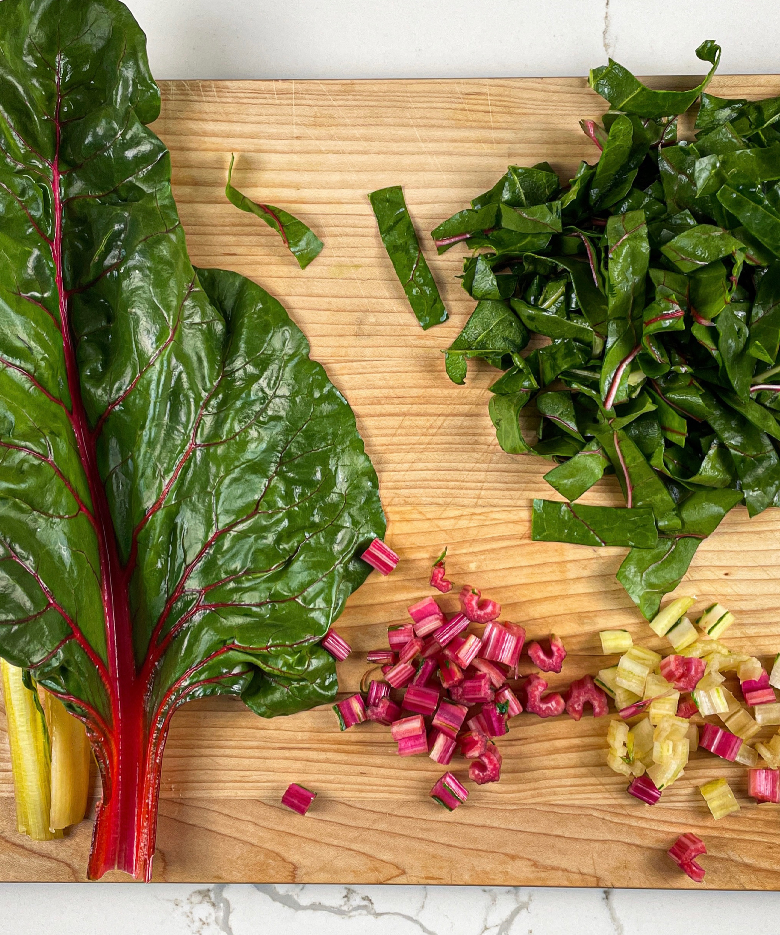 Swiss Chard: Use any type of chard that you like. I always use the stems as well as the leaves. Strip the leaves off of the stems and then chop the stems into small, uniform pieces. Slice the leaves into ribbons. Keep the stems and leaves separate as they will be added at different times. The chard will cook down quite a bit so make sure to use a large bunch or use 2 bunches.