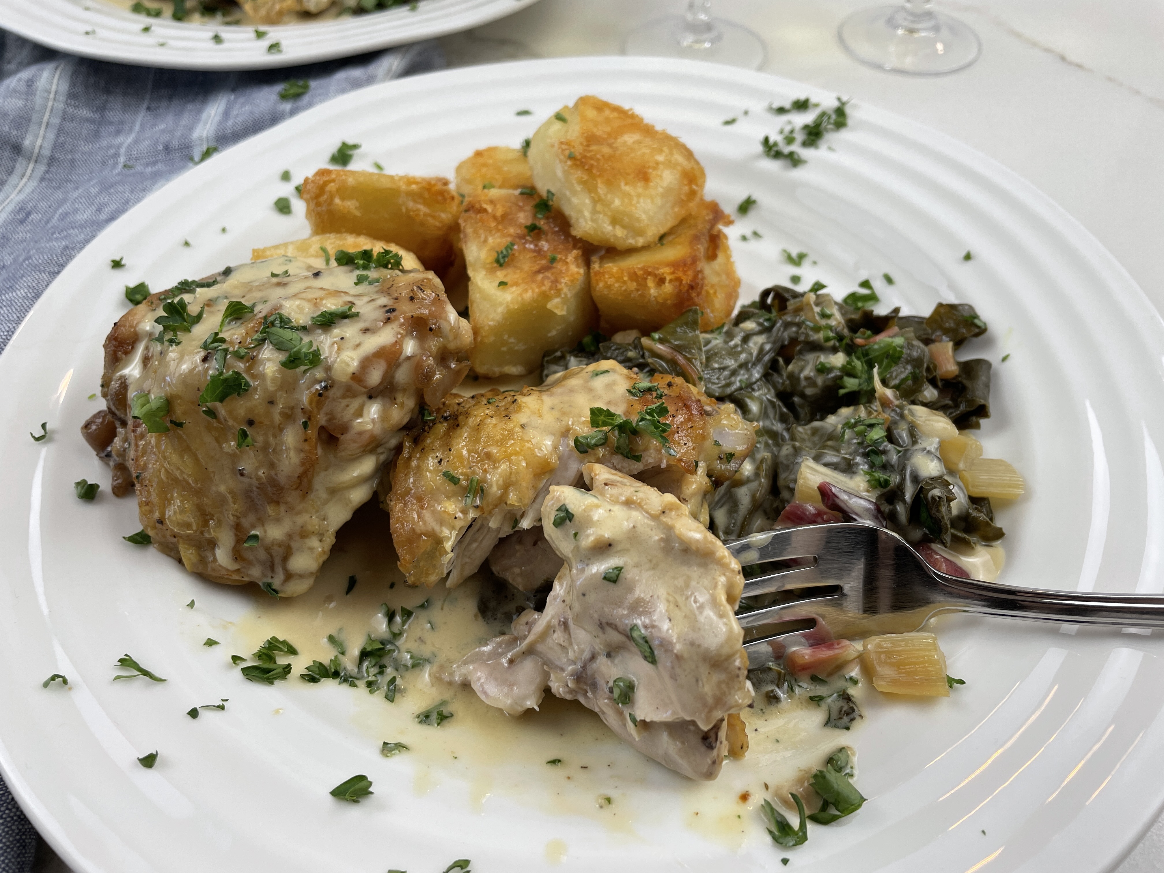 I am always looking for new ways to use chicken thighs and this recipe combines many of my favourite flavours and ingredients. Roasting chicken thighs with the skin on and bone in results in an incredibly tender piece of meat with a deliciously crispy skin. Despite roasting in the cream sauce, the chicken skins here will retain all of that wonderful crispiness. Swiss chard is a favourite of mine and it grows so well that we always make sure to have some in our garden each year. Cooked long in a creamy, lemony sauce the chard becomes extremely tender and picks up all of those wonderful flavours. This is definitely a dish I come back to over and over.