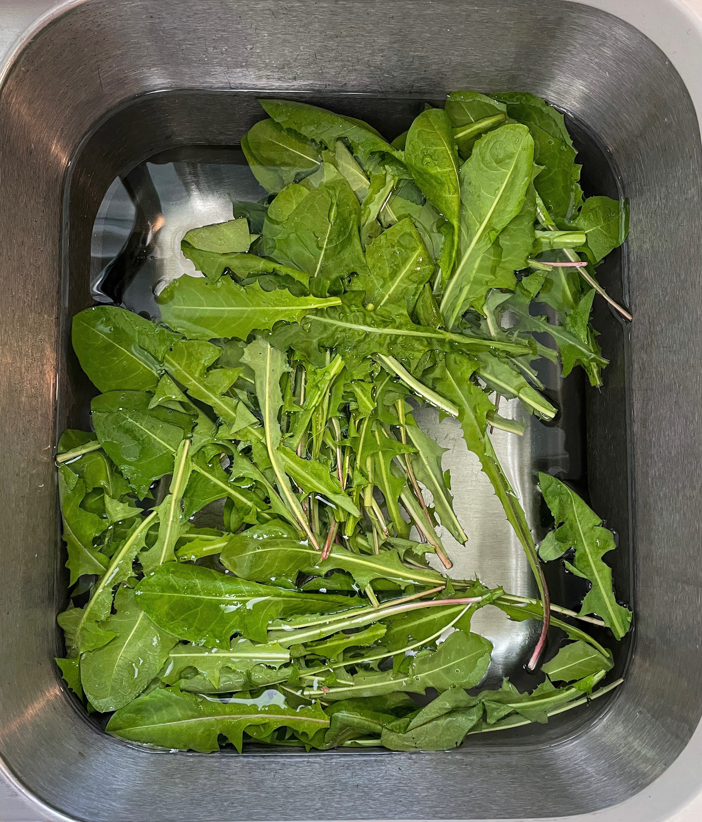 Obviously, the time to harvest dandelions is in spring, particularly when the leaves are young and tender. A good rule of thumb is to pick them when they still have their yellow blooms. I find that as the dandelion plant goes to seed the leaves are starting to toughen up and aren’t as tasty. Be sure to stick to places where you know chemicals or weed killers aren’t being used. Our backyard is usually brimming with them. As with any foraged item make sure to wash them very well. I like to fill a sink up with cold water and then dunk the greens to clean them. I do this two or three times until the water is very clean and there is no more dirt or debris in the water. Spread out on a towel to let dry.