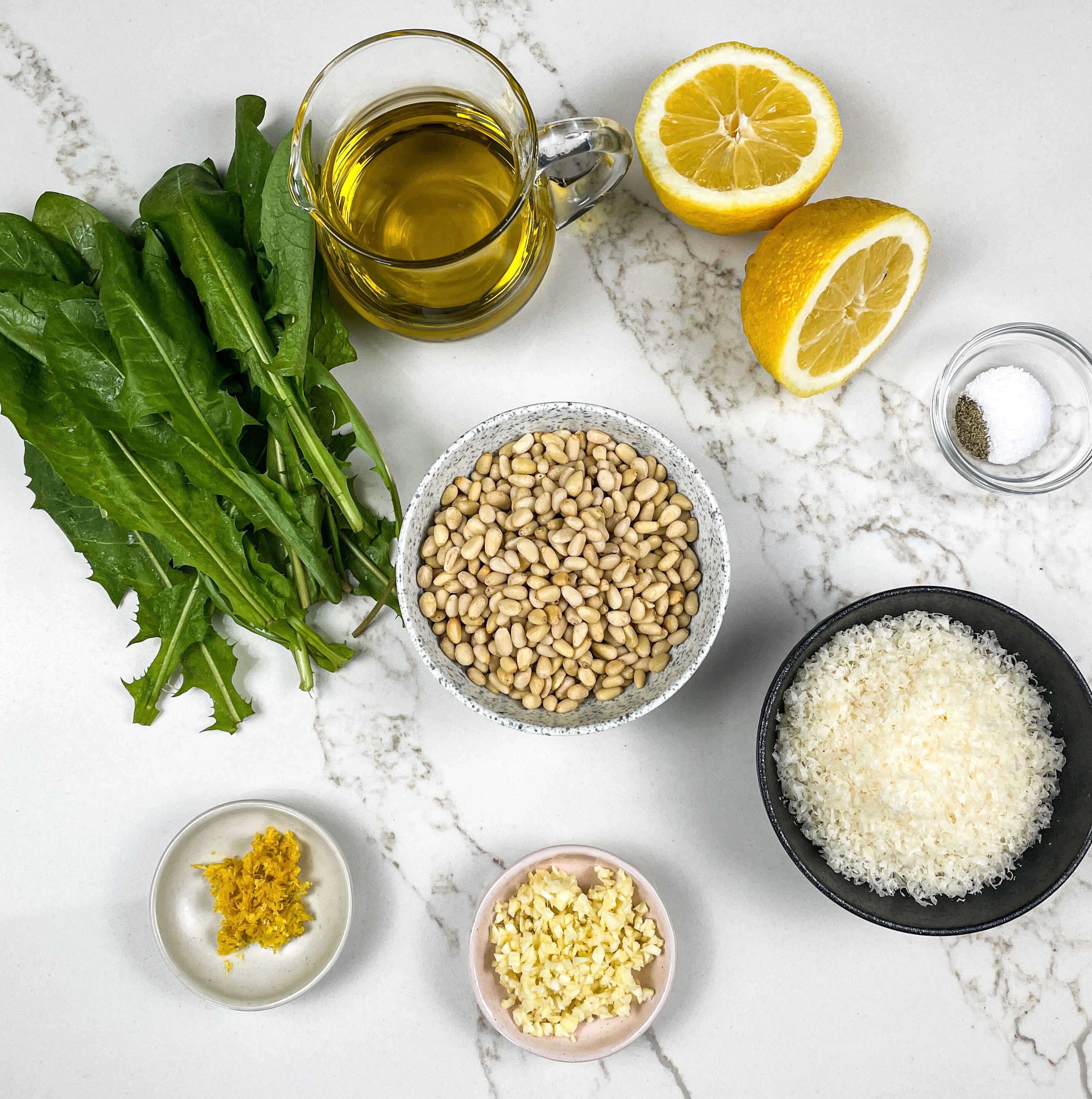 Add the pine nuts to a food processor with the minced garlic and pulse until chopped finely. Add the dandelion greens, lemon zest and juice and run until the mixture is finely minced.