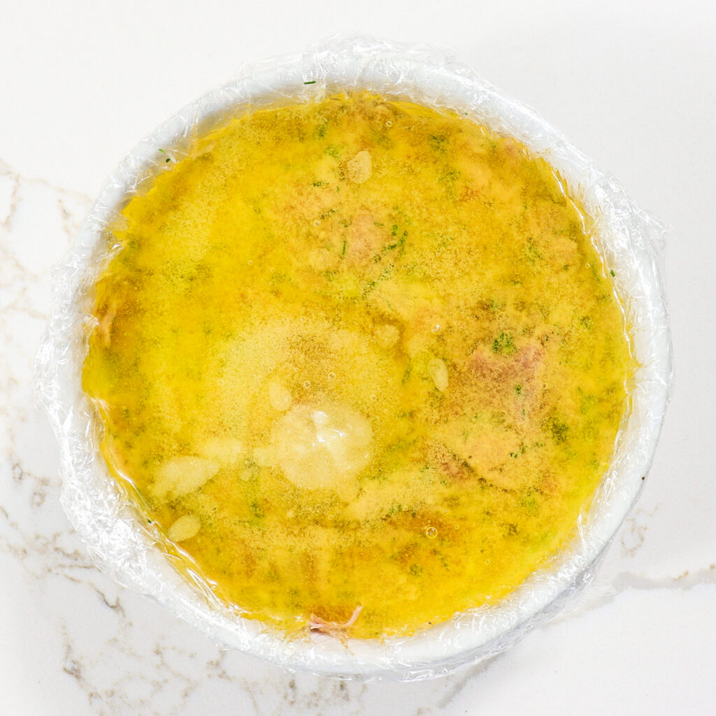 • Line one large ramekin with two layers of cling film if you want to be able to remove the potted ham. Alternatively, you can use 2 or 3 smaller ramekins as needed. Finely shred or mince the ham. Use forks to shred the ham or a food processor to mince it if you prefer. In a mixing bowl, combine the ham with the finely diced pickles, chopped fresh dill, kosher salt, and pepper. Stir together.
