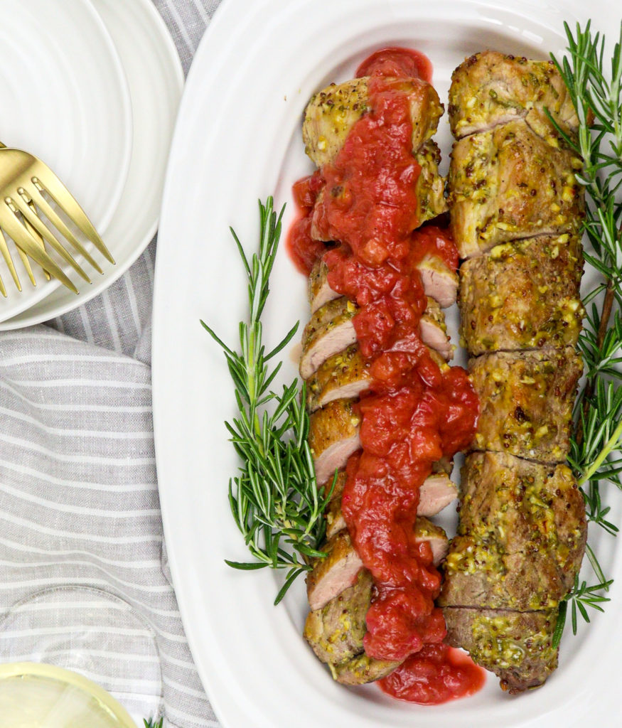 Tender and juicy roast pork tenderloin with a rosemary honey Dijon glaze is topped with a sweet and tangy rhubarb compote for an easy meal that’s sure to delight!