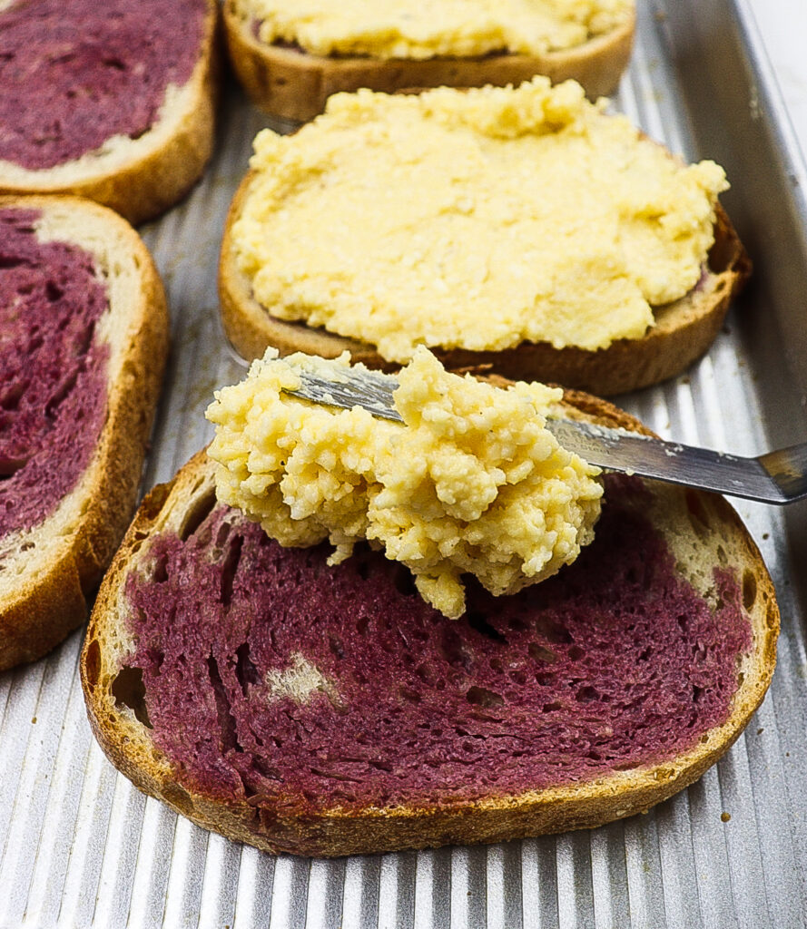 If using, drizzle the bread slices in red wine. Allow the wine to soak in to the bread. Spread a thick layer of the cheese spread over the wine-soaked toast. Broil on high for 3 to 4 minutes, watching closely, until the cheese is melted, bubbling, and just beginning to brown. Serve and enjoy!