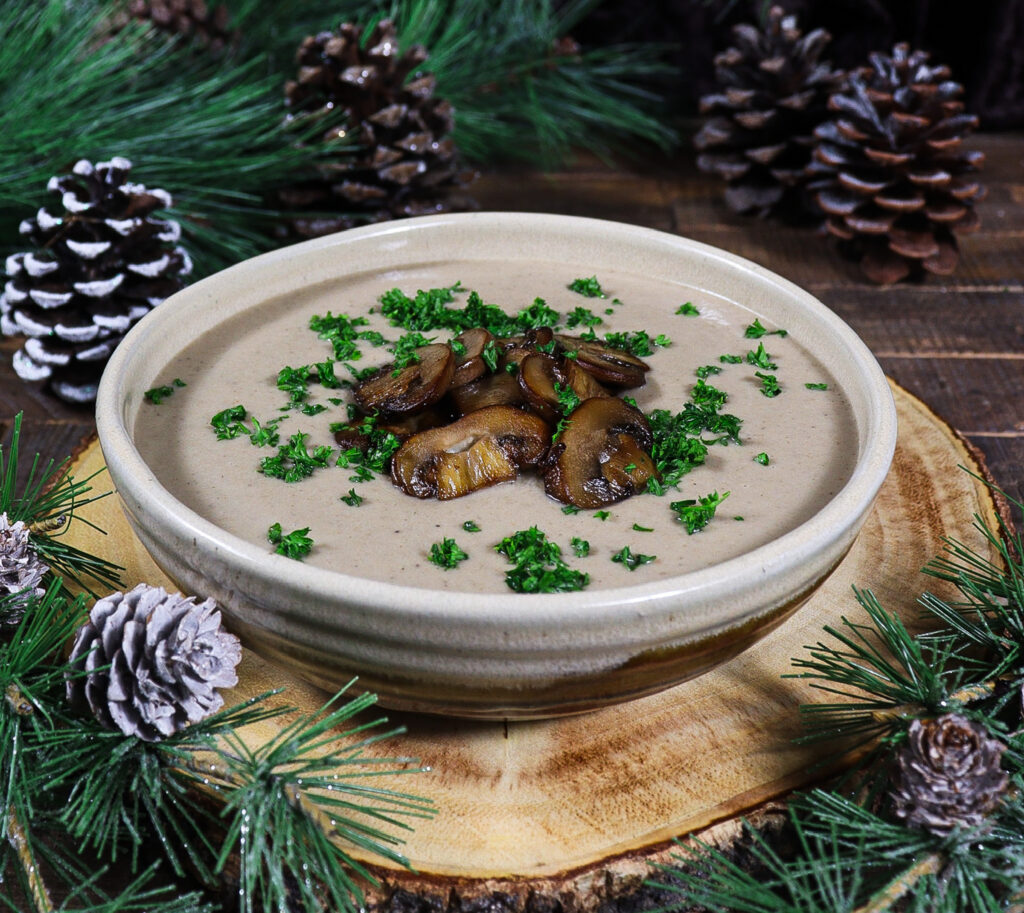 Creamy mushroom soup simmering over the hearth in a cozy hobbit hole is the perfect winter Shire comfort dish. This soup is made with cremini and wild mushrooms, and infused fresh herbs and a splash of sherry.