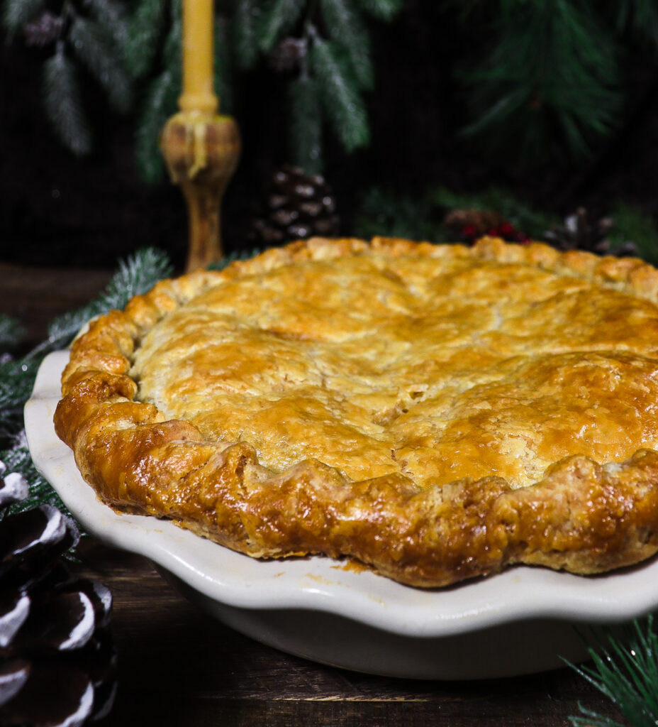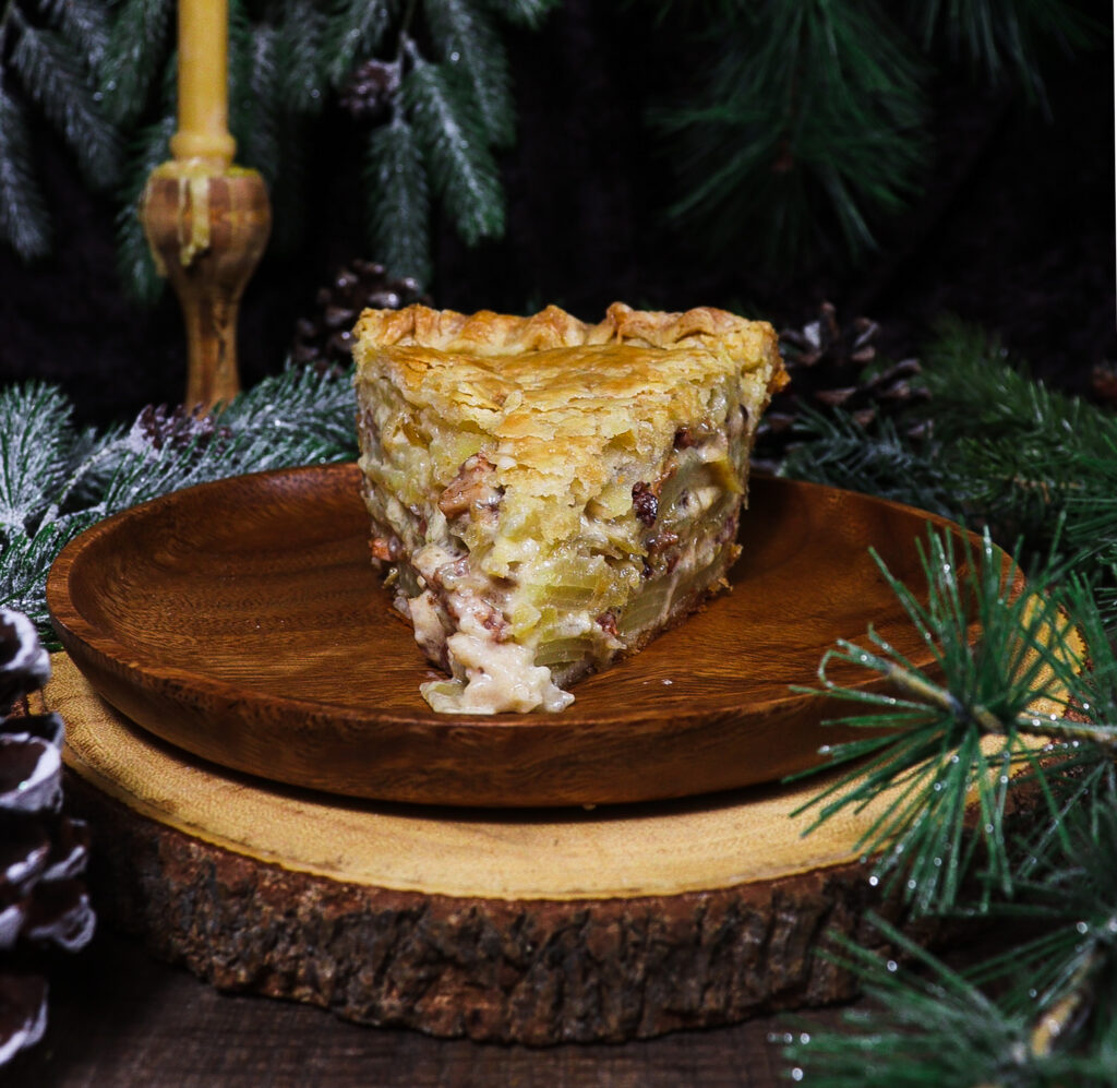 Chase away the winter chill with a slice of cheesy potato bacon pie from the warmth of your hobbit hole. A flaky pie crust is stuffed with layers of potatoes, bacon and cheese and topped with a drizzle of cream.
